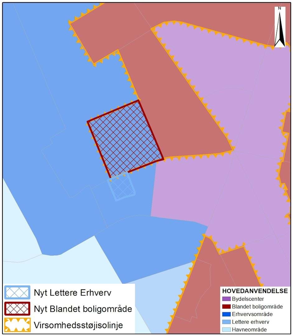 På kommuneplanens farvede hovedstrukturkort ændres en del af Erhvervsområde til Lettere Erhverv og Blandet boligområde. Herved ændres virksomhedsstøjisolinjen. Ændringerne er illustreret på kortet.