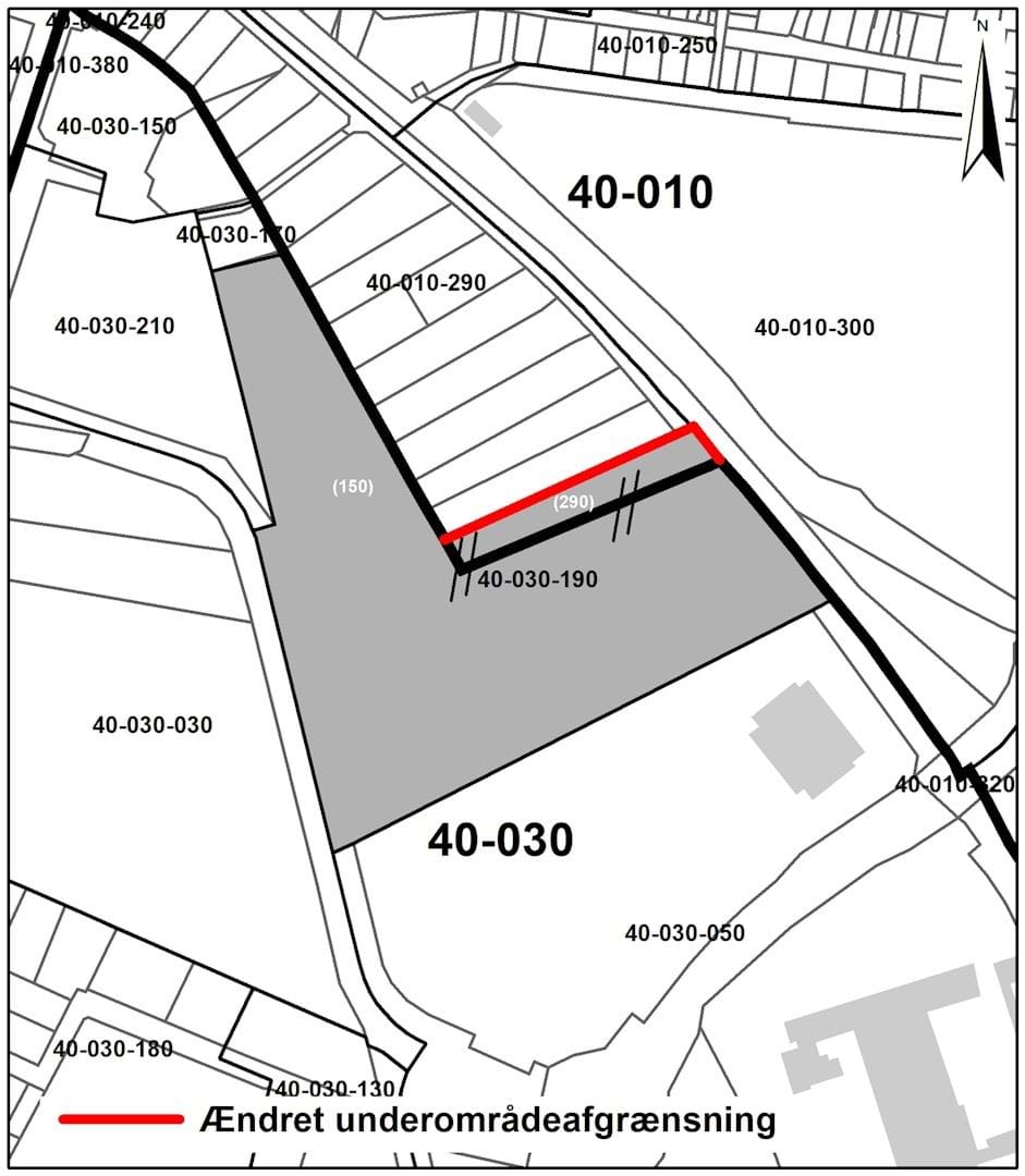 Af kortet kan ses at en del af enkeltområde 40-010-290 overføres til enkeltområde 40-030-190. Hermed ændres underområdegrænsen.