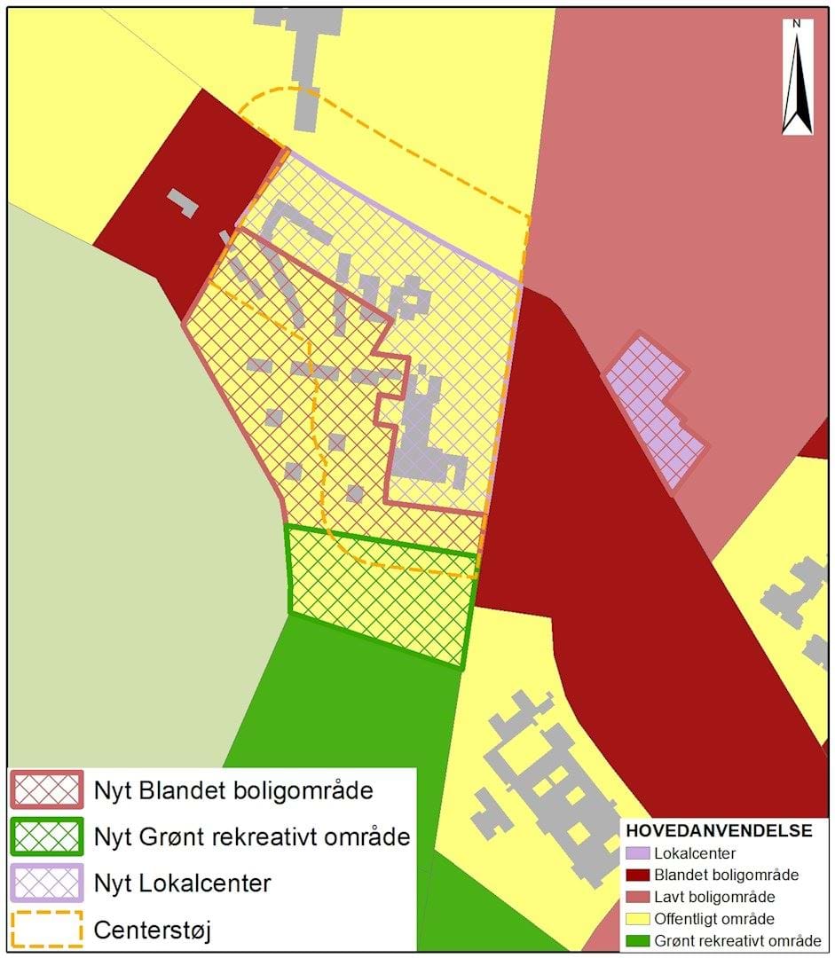 På kommuneplanens farvede hovedstrukturkort ændres en del af Offentligt område til Blandet boligområde, Grønt rekreativt område og Lokalcenter. Eksisterende Lokalcenter ændres til Lavt boligområde. I den forbindelse ændres Centerstøjisolinjen. Ændringerne er illustreret på kortet.