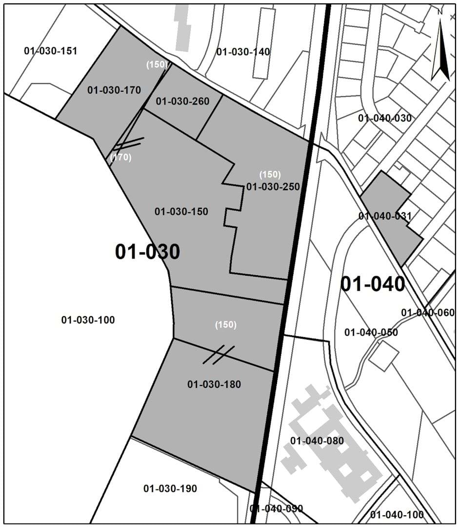 Af kortet kan ses at en del af enkeltområde 01-030-150 udskilles og sammenlægges med 01-030-180. En del af enkeltområde 01-030-150 udskilles som nyt enkeltområde 01-030-250. Lille del af enkeltområde 01-030-170 sammenlægges med enkeltområde 01-030-150 og en lille del af enkeltområde 01-030-050 sammenlægges med enkeltområde 01-030-170. Enkeltområde 01-040-031 fastholdes, men ændre status.