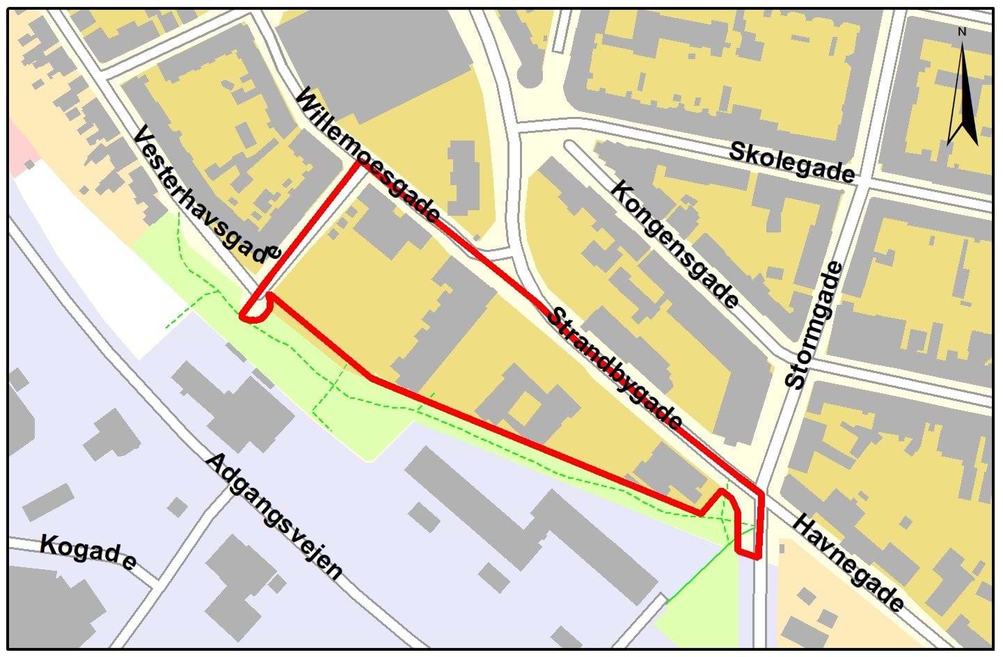 Som det ses på kortet omfatter ændringen et område mellem Strandbygade og Vesterhavsgade i Esbjerg.