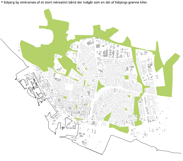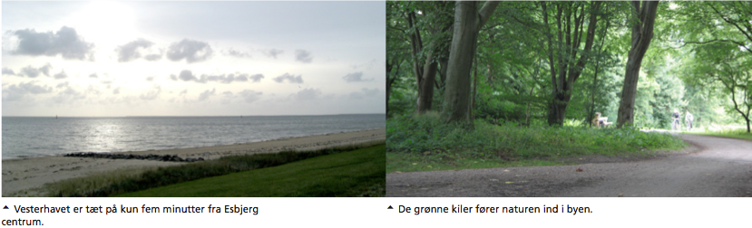 To karakteristiske og værdifulde træk i Esbjergs bystruktur er den nære adgang til havet for byens borgere og de grønne kiler der forbinder by og land og skaber afstand mellem de forskellige bydele. Tilsammen giver det tæthed til natur alle steder i Esbjerg, og betyder at der er rige muligheder for rekreative naturoplevelser hele byen.