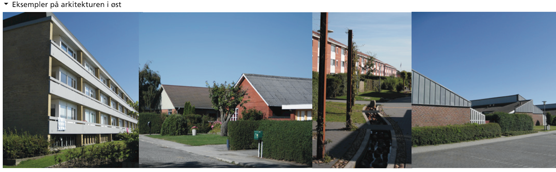 I den østlige del af området er bebyggelsen grupperet i mindre sammenhænge med ensartet arkitektur. Her er mindre områder planlagt og derefter bebygget i løbet af få år. Her findes fine eksempler på efterkrigsårenes småhusarkitektur.