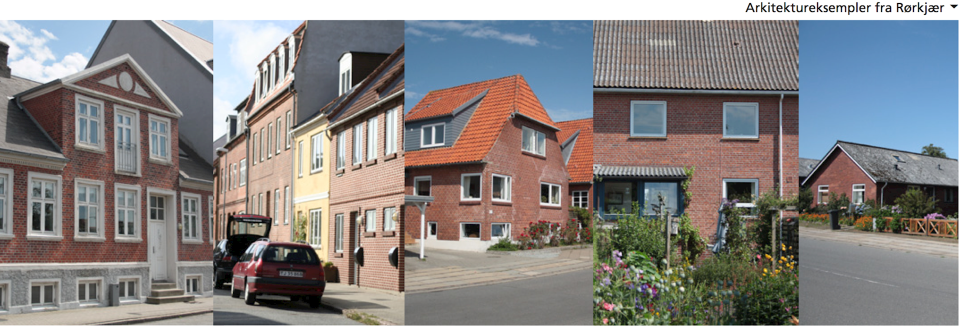 Arkitekturen i Rørkjær afspejler områdets udvikling. Langs Exnersgade findes der stadig større historicistiske byggerier med en stor grad af udsmykning, bygget mens banegården lå på denne side og gaden var ”byens facade”. Nu er gaden nærmere blevet bagside. I slutningen af 1900-tallet gennemgik gaden en sanering og mange af de bevaringsværdige byggerier fremstår i dag i nogenlunde stand. Det bagvedliggende kvarter er karakteriseret af typiske byggeforeningshuse, enkelte parcelhuse samt mange gode gedigne almene boliger, nogle helt tilbage fra midten af 1900-tallet andre væsentligt nyere. Materialevalget er i hele Rørkjær overvejende røde tegl, og det kan sikkert begrundes med teglværkerne store tilstedeværelse i området. De røde tegl giver en ensartethed i områdets bebyggelse og binder på en fin måde områdets forskelligartede byggeri sammen.