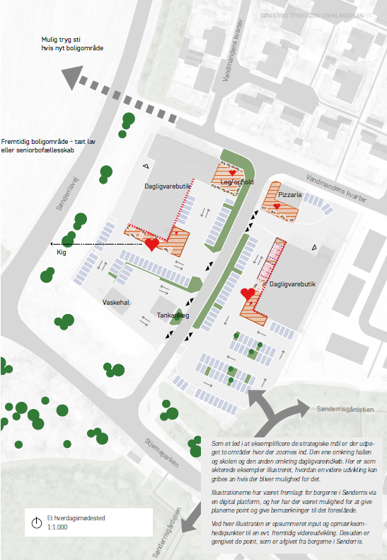 • At det er nemt og sikker, at komme ind og handle, uanset om man er i bil, på cykel eller på gåben. Samt at der bliver en form for samlingsområde, hvor der både er plads til, at børn kan lege og de voksende kan sidde og nye en kop kaffe eller en pizza.