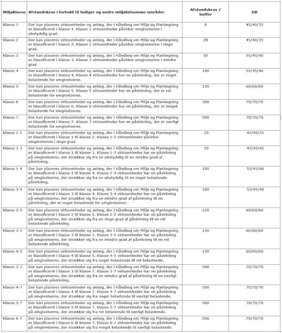 SJ. 1. Miljøklasser. I redegørelsens tabel over miljøklasser er sætningen: ’I landsbyer anvendes ingen støjbuffer’ slettet. I ’Vejledning fra miljøstyrelsen. Ekstern støj fra virksomheder’ (1984) kategoriseres landsbyer på linje med åbent land. Støjende aktiviteter i det åbne land vurderes fra sag til sag, der anvendes derfor ikke generelle støjbufferbestemmelser i det åbne land. Der anvendes ikke miljøklasser i det åbne land. At nævne landsbyer i forbindelse med miljøklasse 3 er følgelig misvisende. For at tabellens klasseinddeling kommer i overensstemmelse med vejledningens inddelinger er der tilføjet fire kategorier (kl. 1-2, kl. 1-4, kl. 3-4 og kl. 2-5) til tabellen. Redegørelsesteksten er herudover udvidet til at omfatte miljøgener generelt.