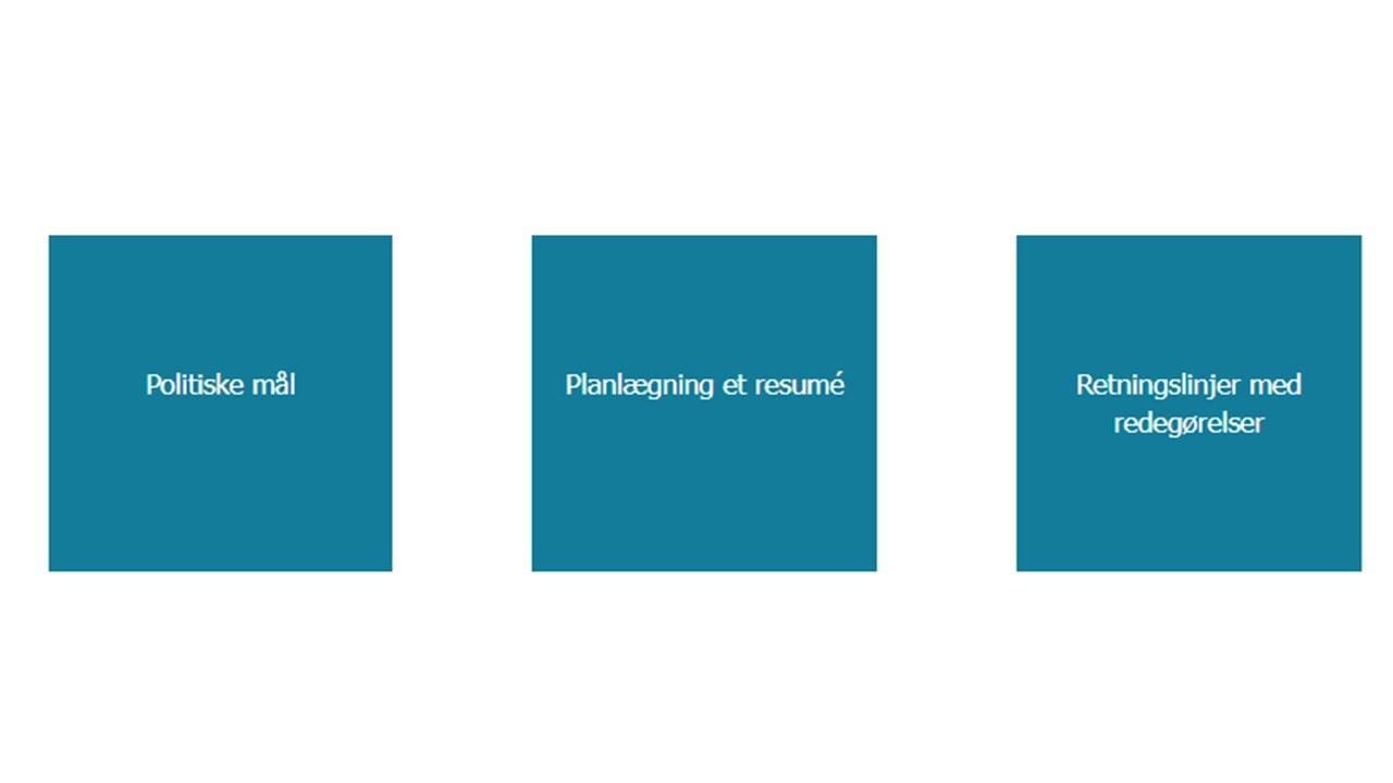 Bortset fra dette indledende kapitel præsenteres alle kommuneplanens kapitler i hovedstrukturen på samme måde med en overskrift, et statement for kapitlet og tre klikbare blå bokse: