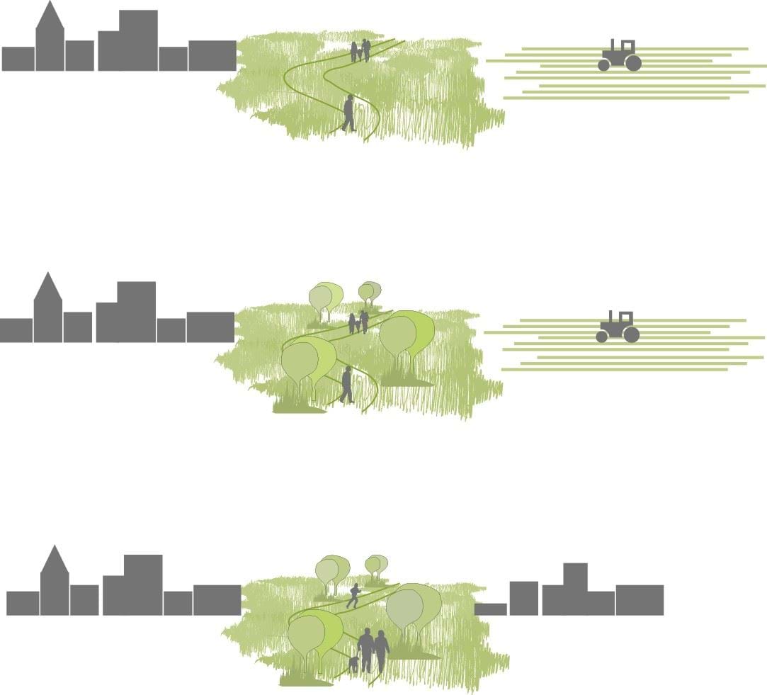 Gennem hensigtsmæssig udformning af de grønne byrande styrkes overgangene mellem by og land.