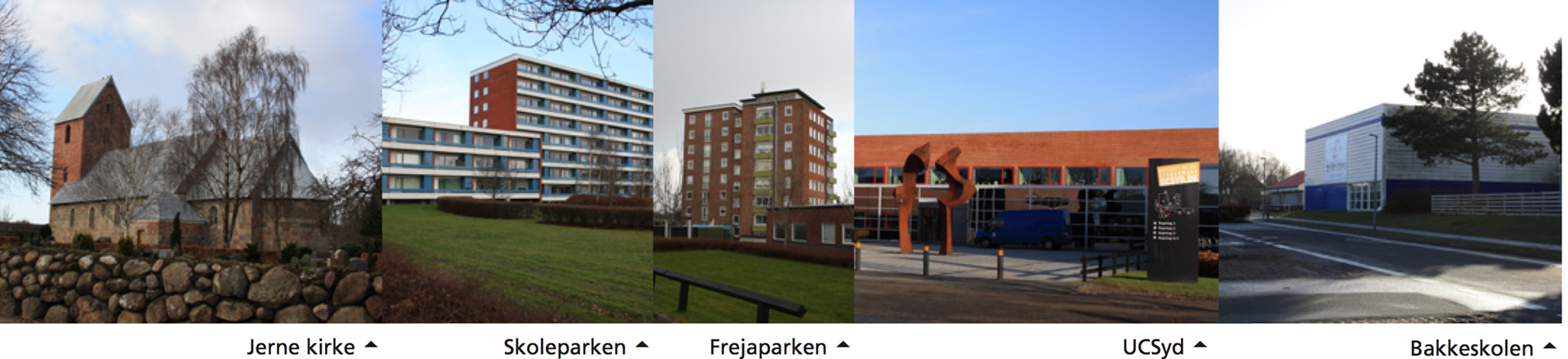 Endelig fungerer de to institutionsbyggerier Bakkeskolen Cosmos og UC Syd som pejlemærker både via deres omfang og funktion. I det østlige område findes Novrup Kapel som et kendt pejlemærke.