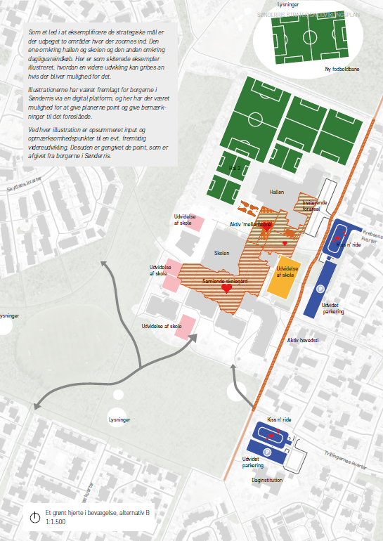 Det er morgenmylder og børnene skal i børnehave og skole. Det er trygt at sende dem afsted og de lærer at færdes selv. Stien er deres og tydelig afmærkning sørger for at cykler og gående ikke rammer sammen. Efter skole og arbejde er det tid til sport og bevægelse. Afsted til hallen, så der kan komme sved på panden. En tur i skoven eller ud i den friske luft på boldbanerne omgivet af høje træer, der skaber læ og oplevelsen af at være i et grønt åndehul.